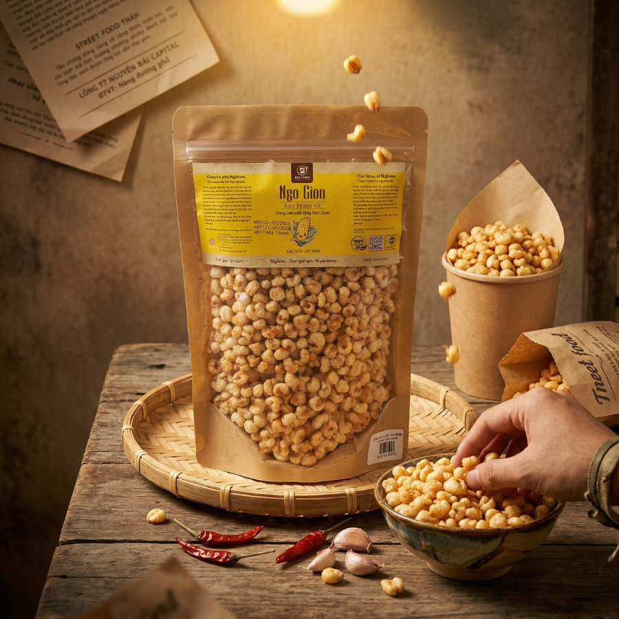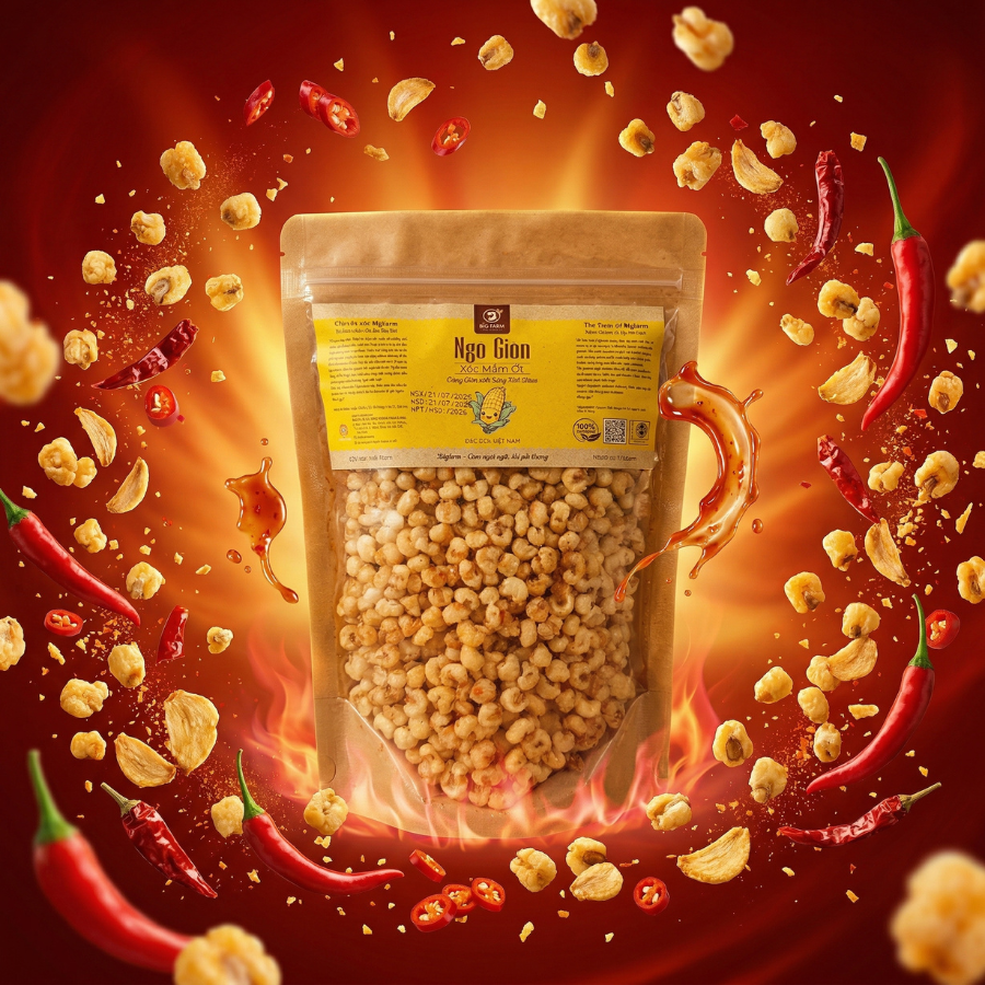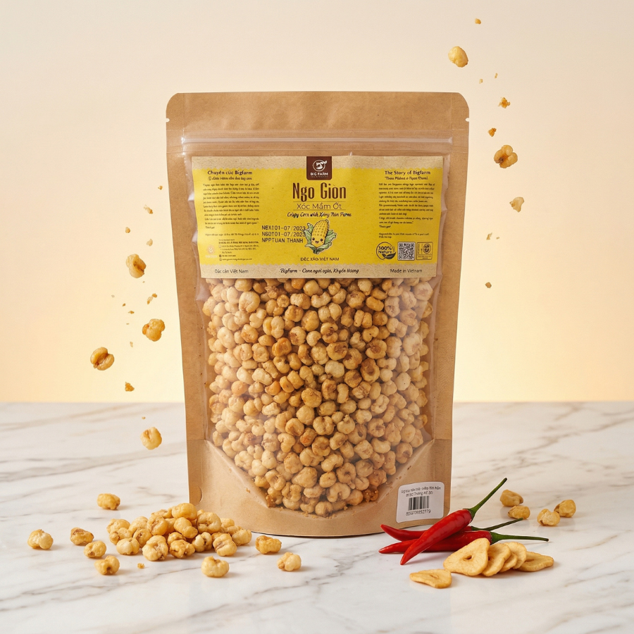 Ngô giòn xóc mắm ớt cay Bigfarm là sự nâng tầm của món ăn vặt truyền thống lên một đẳng cấp mới. Từ những hạt ngô nếp tuyển chọn, trải qua quy trình sấy hiện đại để đạt độ giòn tan lý tưởng, sau đó được xóc đều với nước mắm cốt thượng hạng, đường cát và ớt sấy cay nồng. Mỗi hạt ngô vàng óng, thấm đẫm gia vị, mang đến một trải nghiệm ẩm thực bùng nổ, là “người bạn đồng hành” tuyệt vời cho mọi cuộc vui.